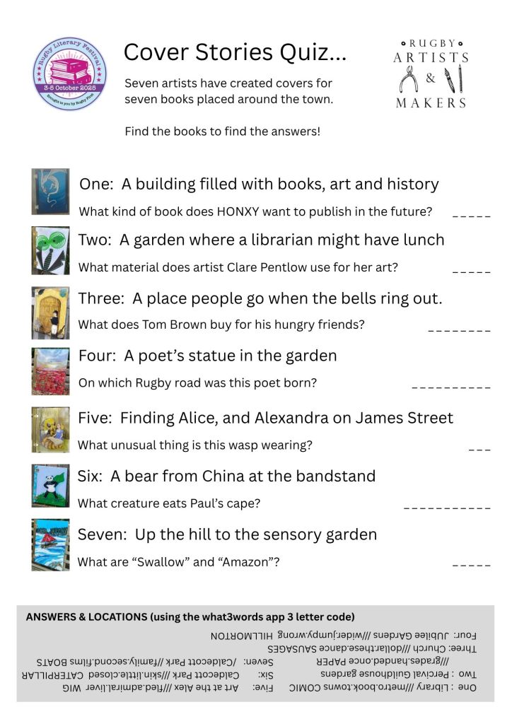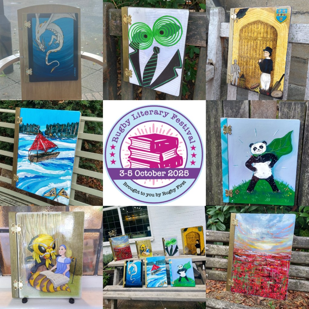 Rugby Artists and Makers took part in the Rugby Literary Festival, 2025. Seven of our artists and makers created covers for seven books by authors past, present and future and these were installed around the town. At the end of the festival they continued to be on display under the garden veranda at Art at The Alex.